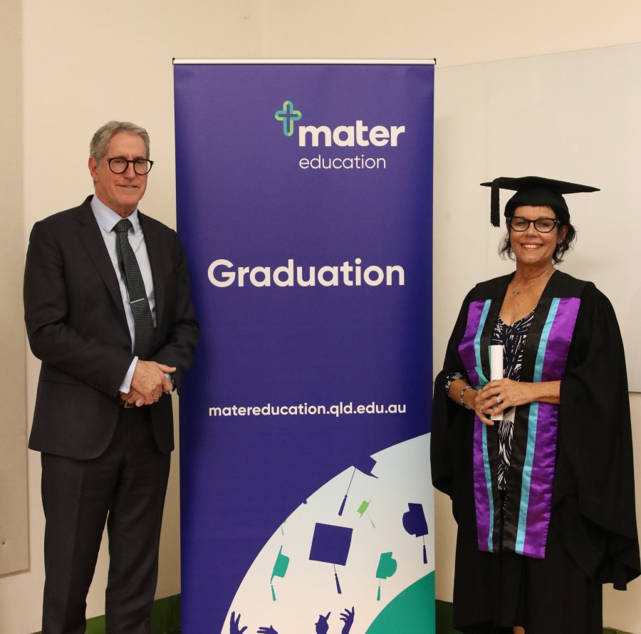 Pictured: Beverly with Mater CEO, Peter Steer, at her Diploma of Nursing graduation ceremony in May 2021.